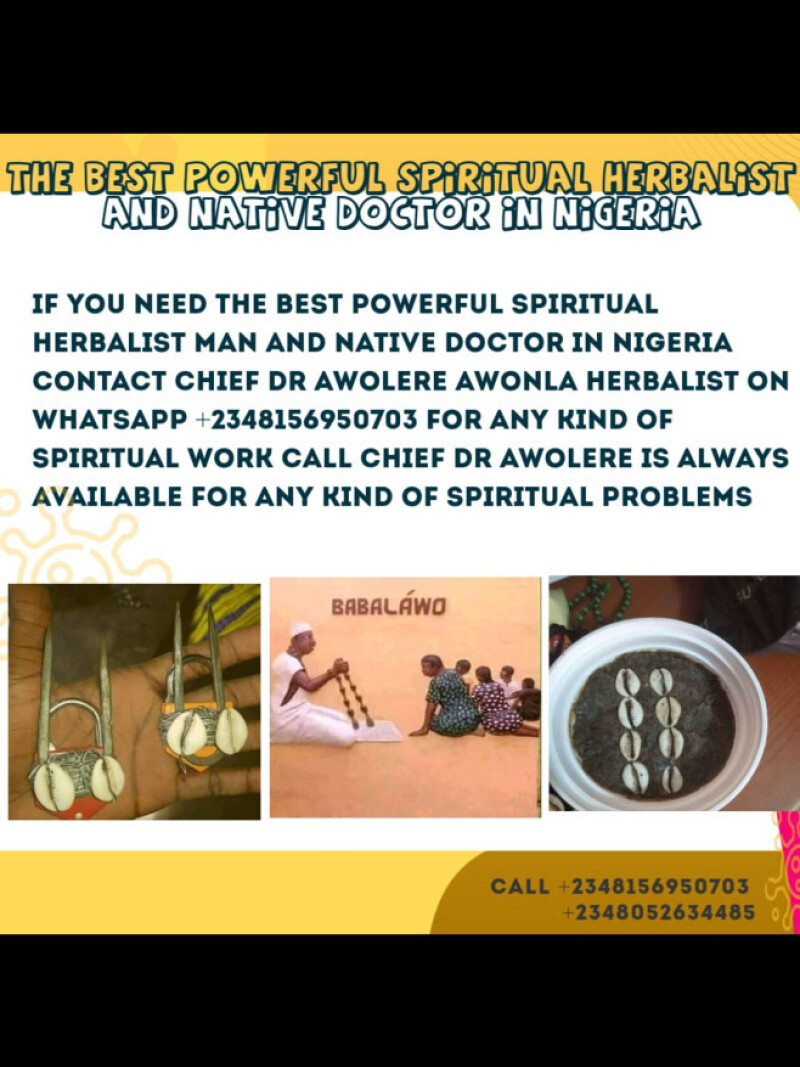 IF YOU NEED THE BEST POWERFUL SPIRITUAL HERBALIST IN NIGERIA CALL CHIEF AWOLERE HERBALIST +2348156950703 is known to be, most powerful native doctor from the ancient time till now, CHIEF AWOLERE HERBALIST lives strong among all other native doctors, there had never been any form of impossibility beyond the control of CHIEF AWOLERE HERBALIST . it is the assignment of the native doctor CHIEF AWOLERE HERBALIST to offer services to those in need of spiritual assistance not minding the gravity of your situations or distance as long as Water, Sea, Ocean, Lake, River, Sand, etc. are near you and you are still breathing Air, then your problems of life will be bygone. if you need any spiritual help on any of these.